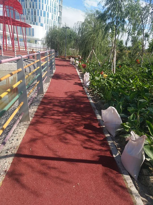 1.現(xiàn)在政府提倡城市綠化,道路美化工程也在逐漸增多,一些自行車道,健身步道和景區(qū)步道的彩色防滑路面做的很多,材料也是參差不齊,一般要滿足耐磨防滑,不易褪色,使用壽命長(zhǎng)的功能,你可以咨詢鴻坤的彩色防滑路面材料,使用綠道樹(shù)脂上面撒是陶瓷顆粒施工,做出來(lái)的效果如下圖: